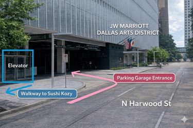 Walk back toward the garage entrance at Ross Ave & N Harwood St.