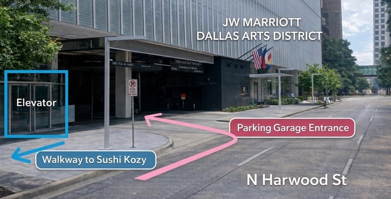 Walk back toward the garage entrance at Ross Ave & N Harwood St.